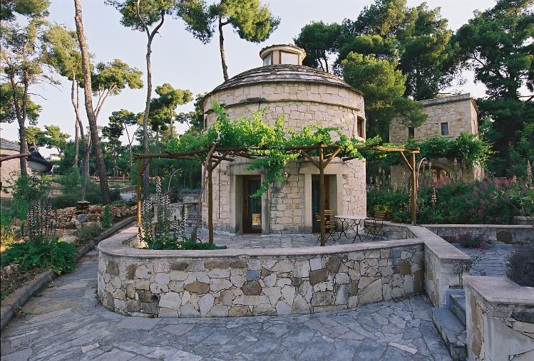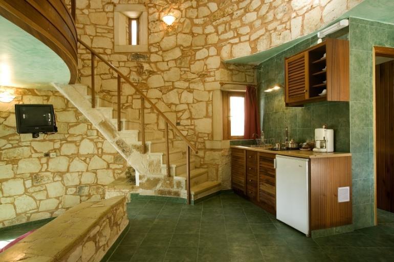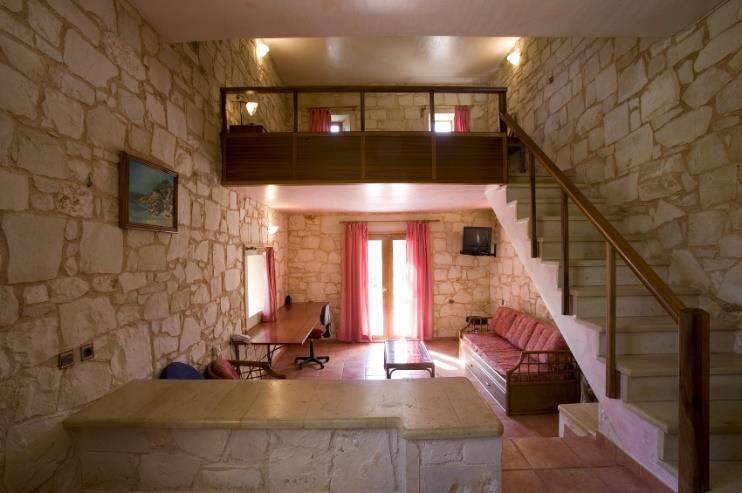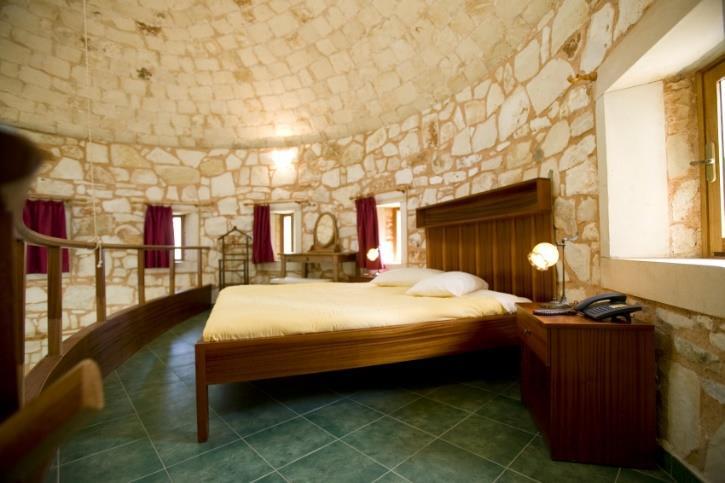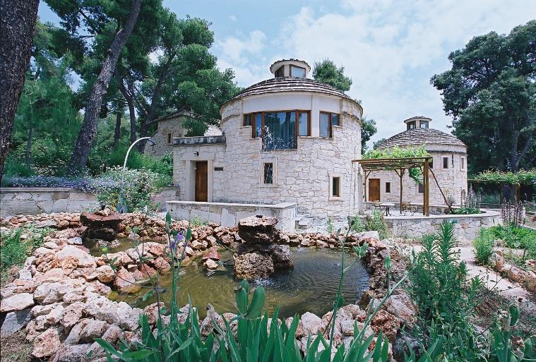 Traditional stone houses on the Conference campus can accommodate a limited number of participants. Each stone house is a two-level traditional apartment, featuring a double bed on the upper level and a lounge on the lower level with one or two single sofa beds. All stone houses are equipped with a kitchenette, a work area, and a TV. The rate is per house, regardless of the number of occupants. Each house also includes a private patio. There are two types of stone houses available: round and square.